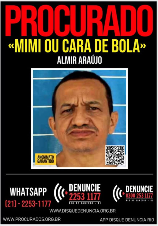 Almir Araújo, vulgo "Mimi ou Paraíba ou Cara de Bola", de 54 anos, se encontra na condição de Evadido do Sistema Penitenciário, desde do dia 22 de março de 2024.