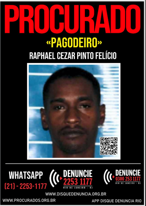 RAPHAEL CEZAR PINTO FELICIO, vulgo "Pagodeiro", de 34 anos, se encontra na condição de Evadido do Sistema Penitenciário, desde 30 de dezembro de 2025, após receber o benefício de Indulto de Natal de 2025, e não retornar mais sua unidade prisional.