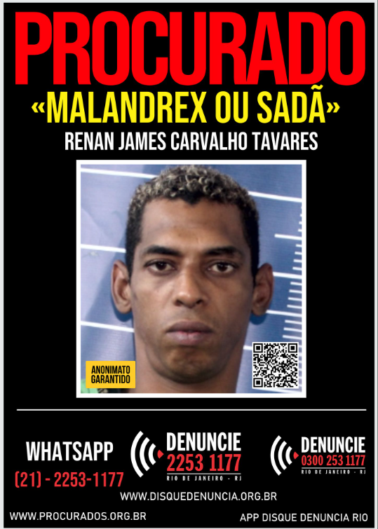 RENAN JAMES CARVALHO TAVARES, vulgo "Malandrex ou Sadã", de de 35 anos, se encontra na condição de Evadido do Sistema Penitenciário, desde o dia 17 de maio de 2025.