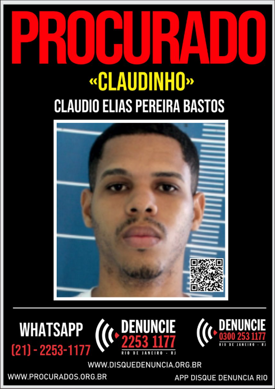 Claudio Elias Pereira Bastos, vulgo "Claudinho", de 31 anos, se encontra na condição de evadido do sistema penitenciário, desde o dia 18 de outubro de 2025, após progredir do sistema fechado para o semiaberto, com direito o saídas extramuros, e não retornou mais a sua unidade prisional.